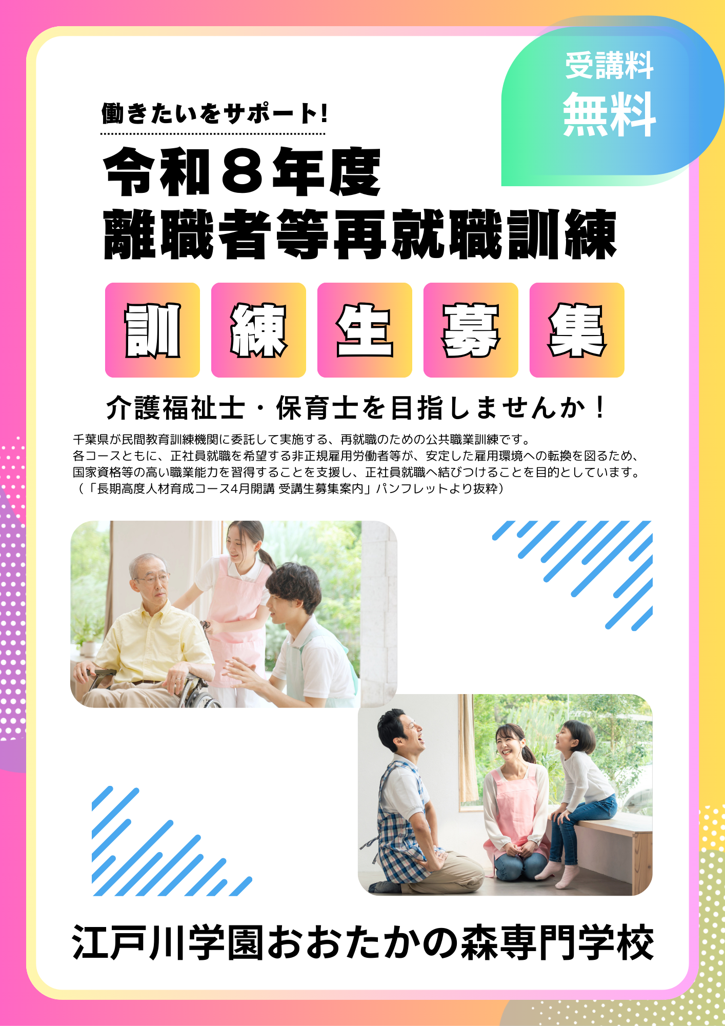 令和8年(2026年)4月開講の「介護福祉士コース」および「保育士コース」の募集を行います。