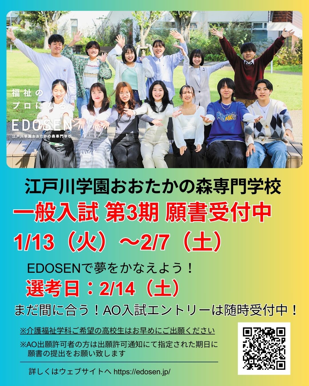 一般入試(第3期)、AO出願許可者 の願書受付を1月13日(火)より開始いたします。